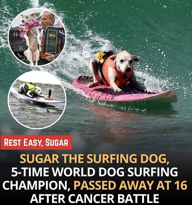 Sugar, a five-time world champion in dog surfing, passed away at the age of 16 after bravely battling cancer, her family shared on Instagram. Known not only for her incredible talent in the waves but also for her loving spirit, Sugar touched countless lives both in and out of the water.